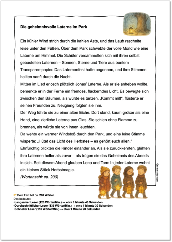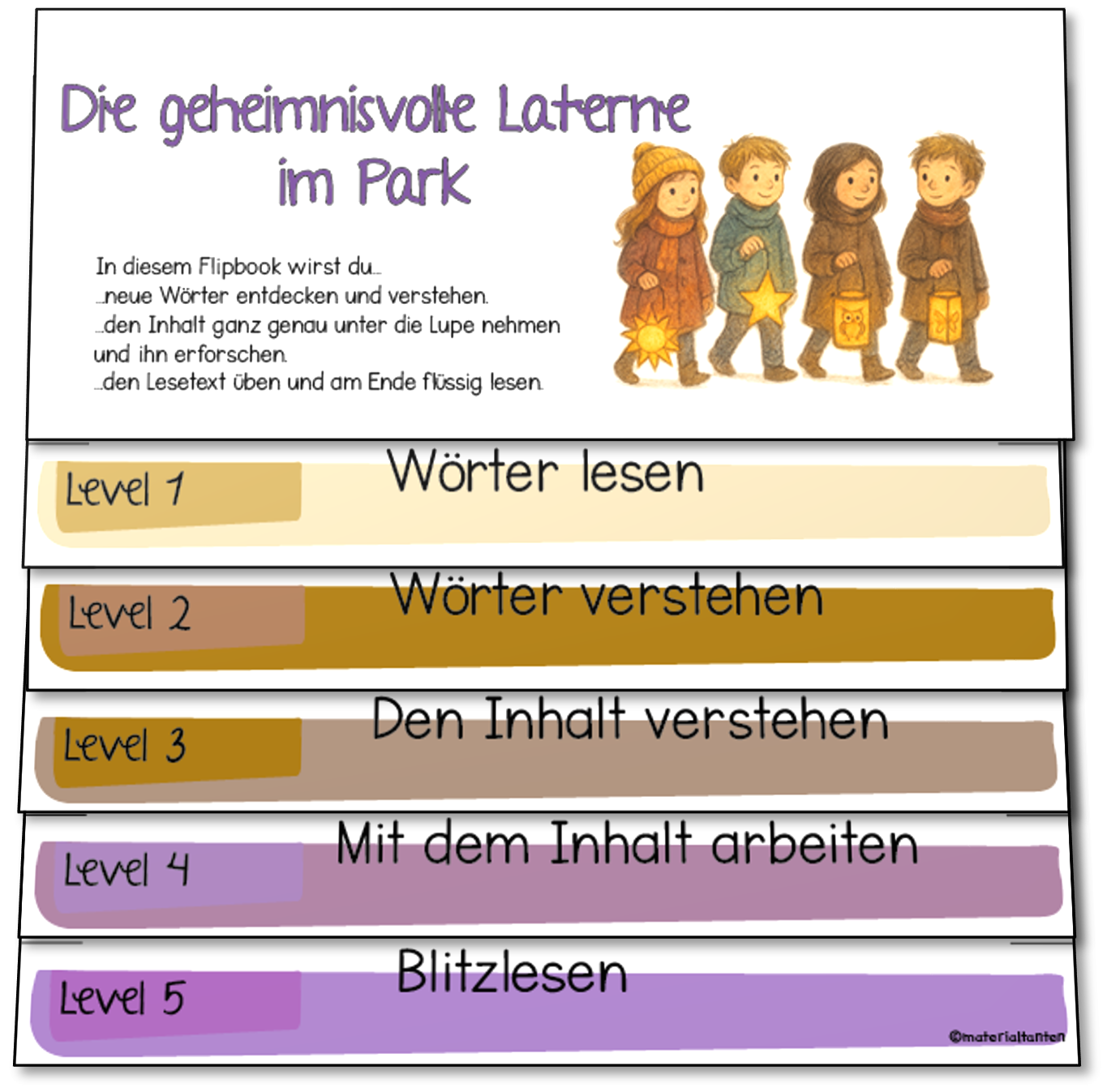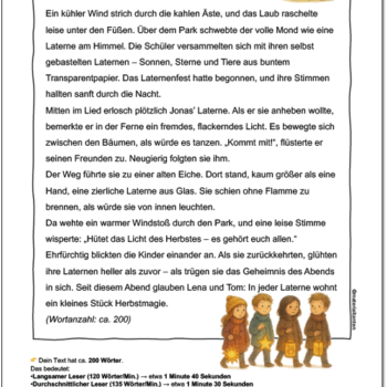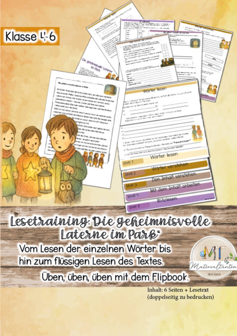 Dieses liebevoll gestaltete Flipbook bietet Schülerinnen und Schülern der Klassen 4 bis 6 ein abwechslungsreiches und strukturiertes Training rund um den Lesetext „Die geheimnisvolle Laterne im Park“. Es eignet sich ideal für den Einsatz im Unterricht, in Förderstunden, bei Wochenplanarbeit oder in der Freiarbeit.