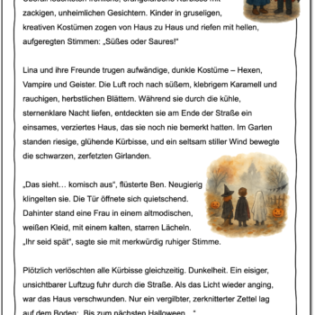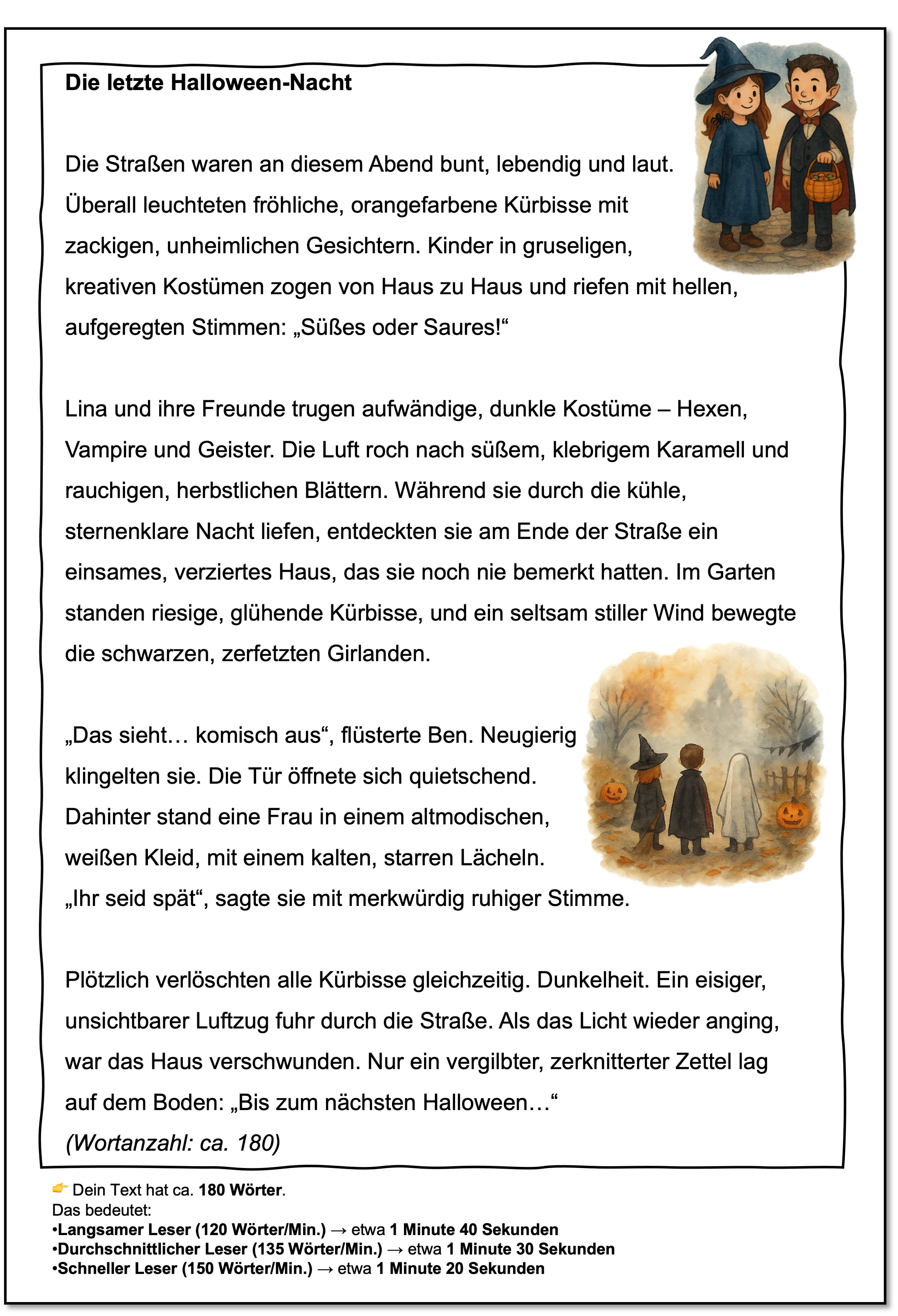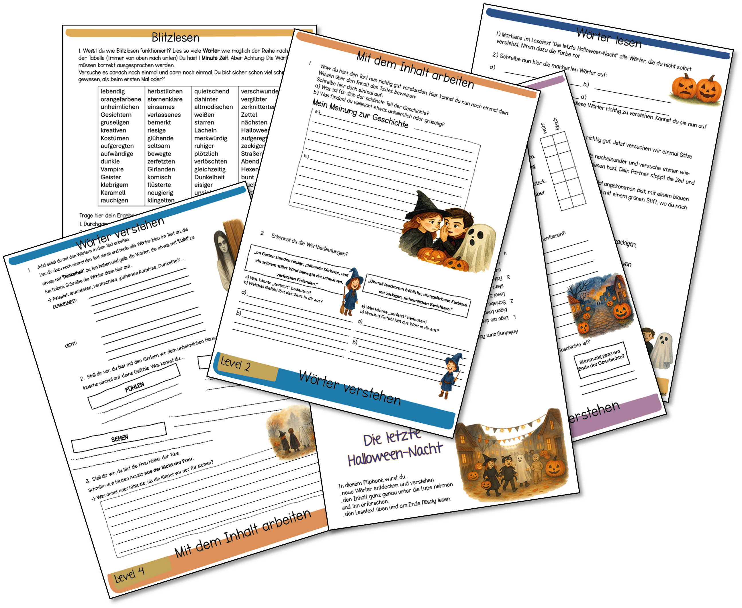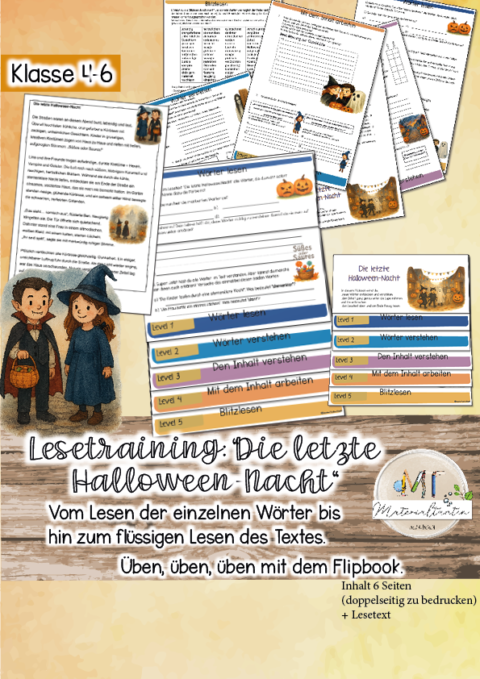 Dieses liebevoll gestaltete Flipbook bietet Schülerinnen und Schülern der Klassen 4 bis 6 ein abwechslungsreiches und strukturiertes Training rund um den Lesetext „Die letzte Halloween-Nacht“. Es eignet sich ideal für den Einsatz im Unterricht, in Förderstunden, bei Wochenplanarbeit oder in der Freiarbeit.