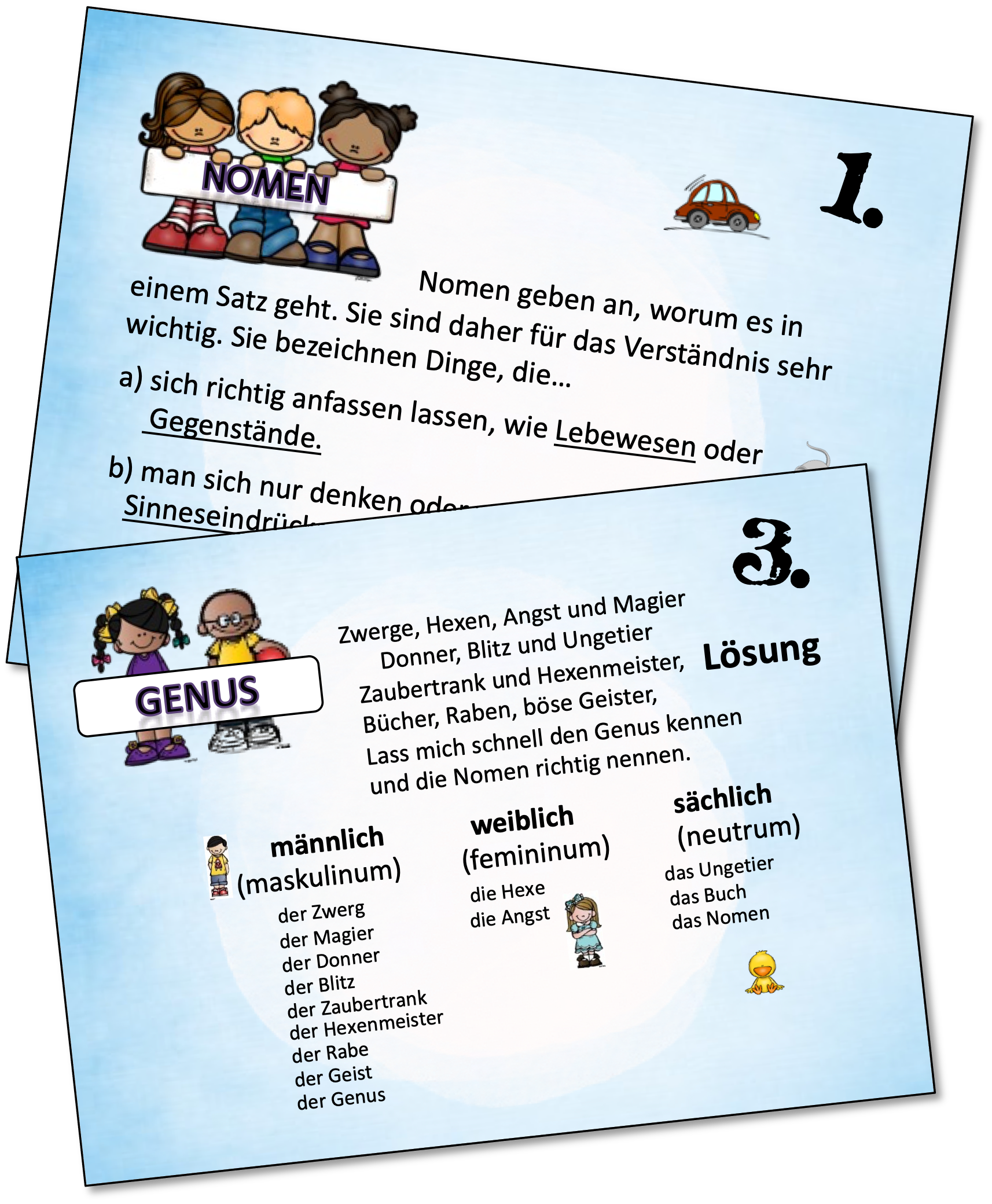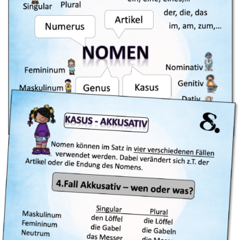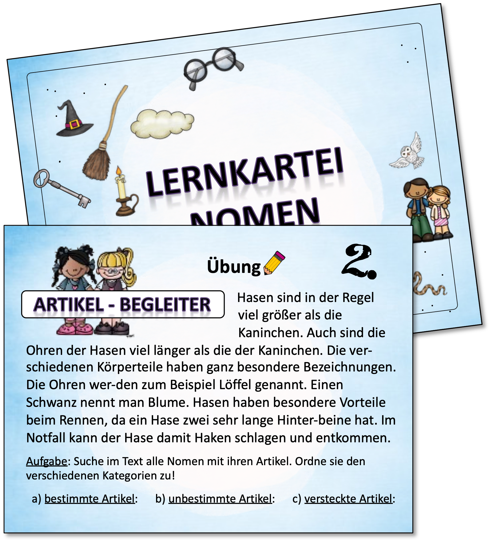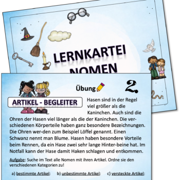 Diese Kartei ist zum Lernen und Üben geeignet. Idealerweise passt der Inhalt auf die Klassenstufe 5/6. Auf Karten in DinA5 werden die Merkmale und Eigenheiten der Wortart Nomen erklärt und direkt dazu eine Übung angeboten.