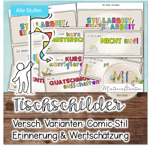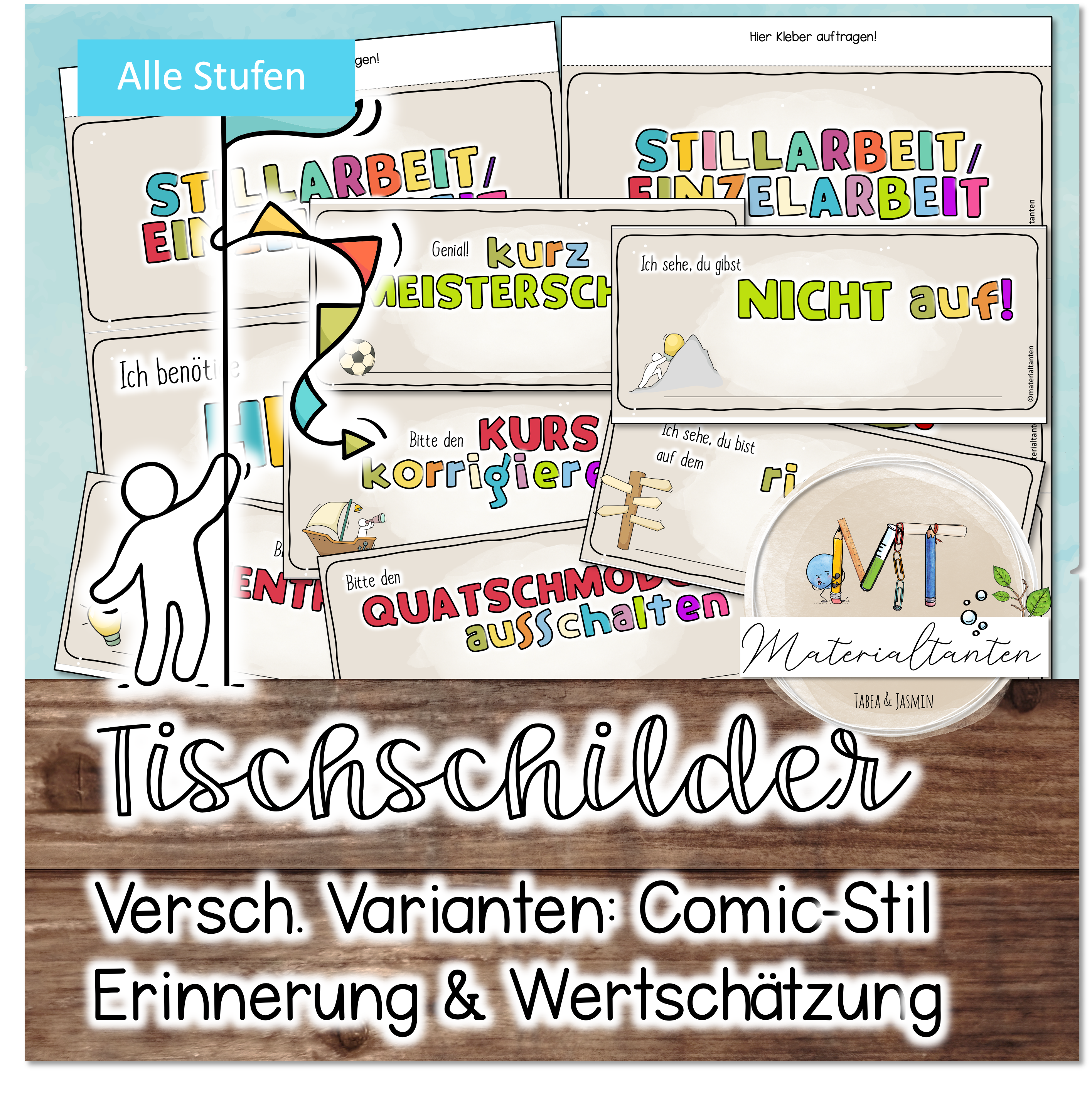 Tischschilder: Classroommanagement – Erinnerung und Wertschätzung im Comic-Stil